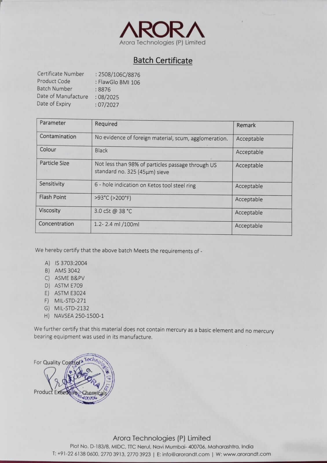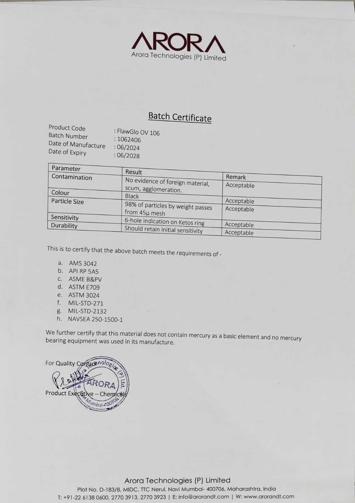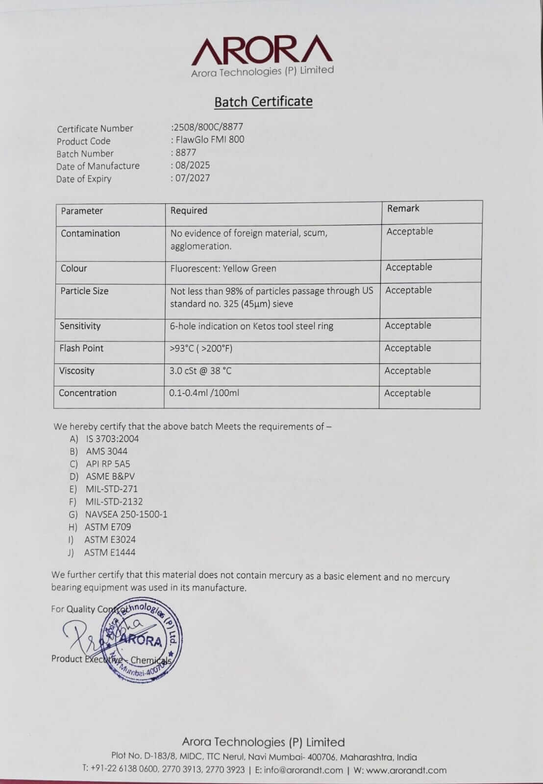 IS 3703:2004, ISO 9934-2, AMS 3044, API RP 5A5, ASME B&PV,
