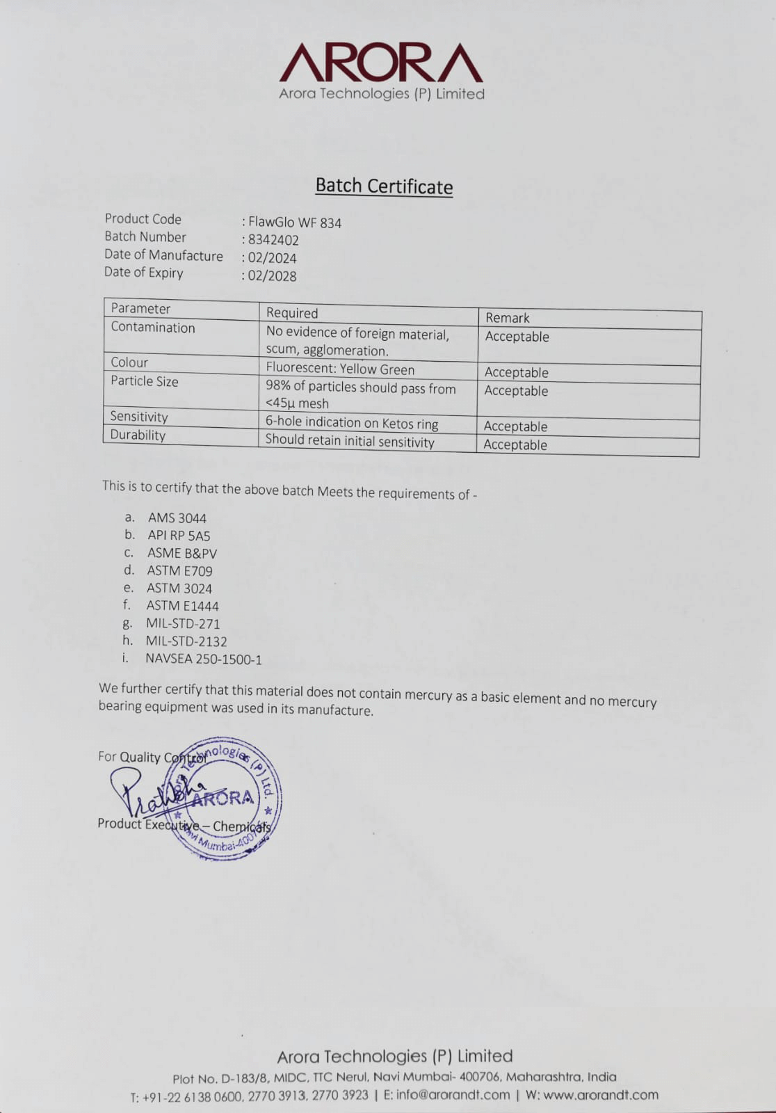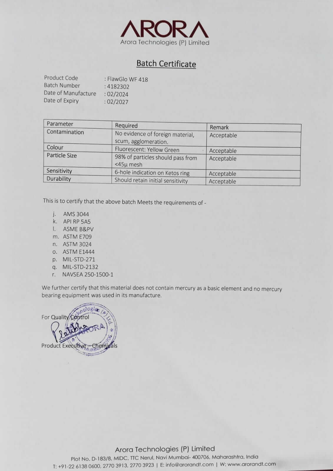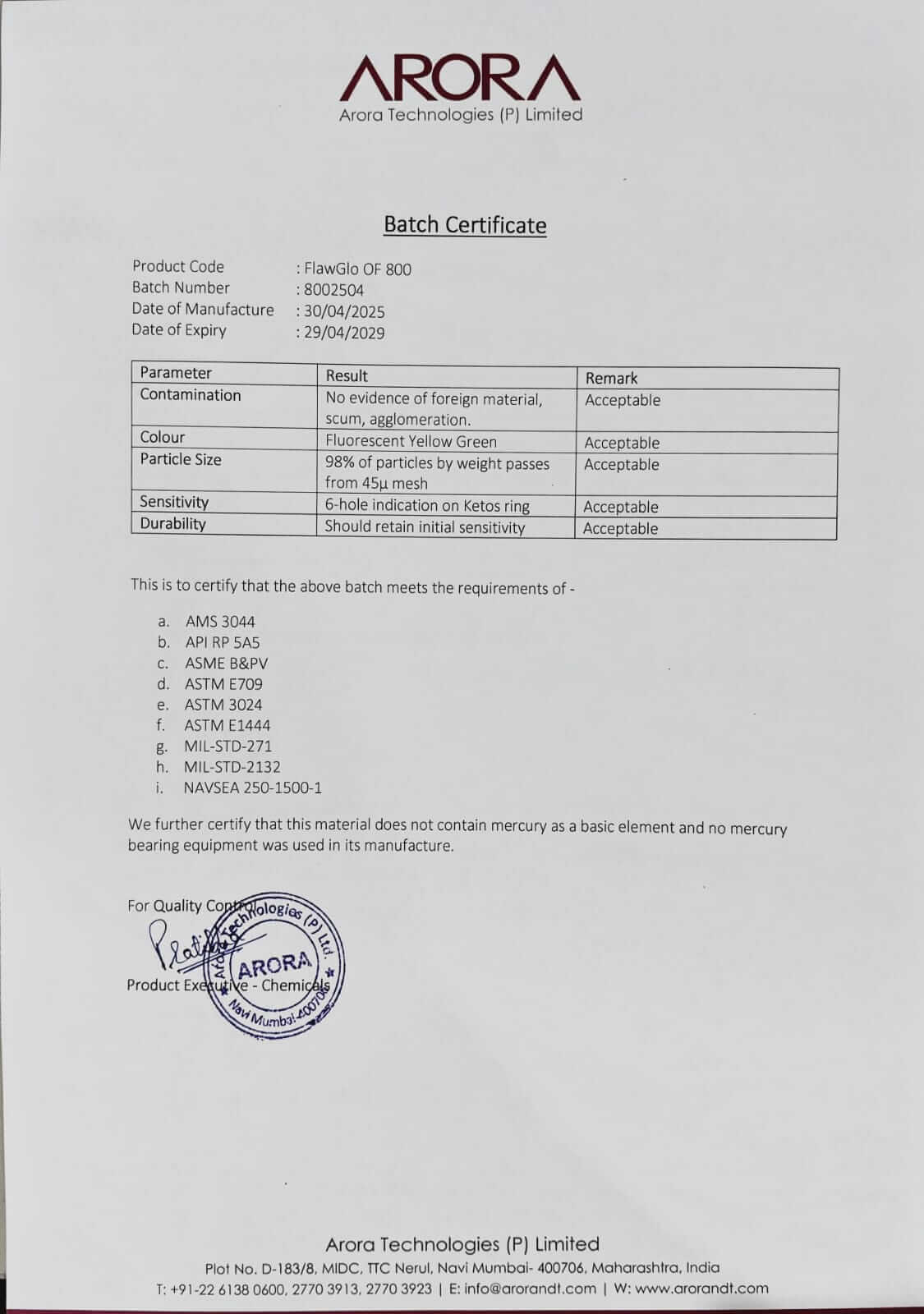 IS 3703:2004, ISO 9934-2, AMS 3044, API RP 5A5, ASME B&PV,